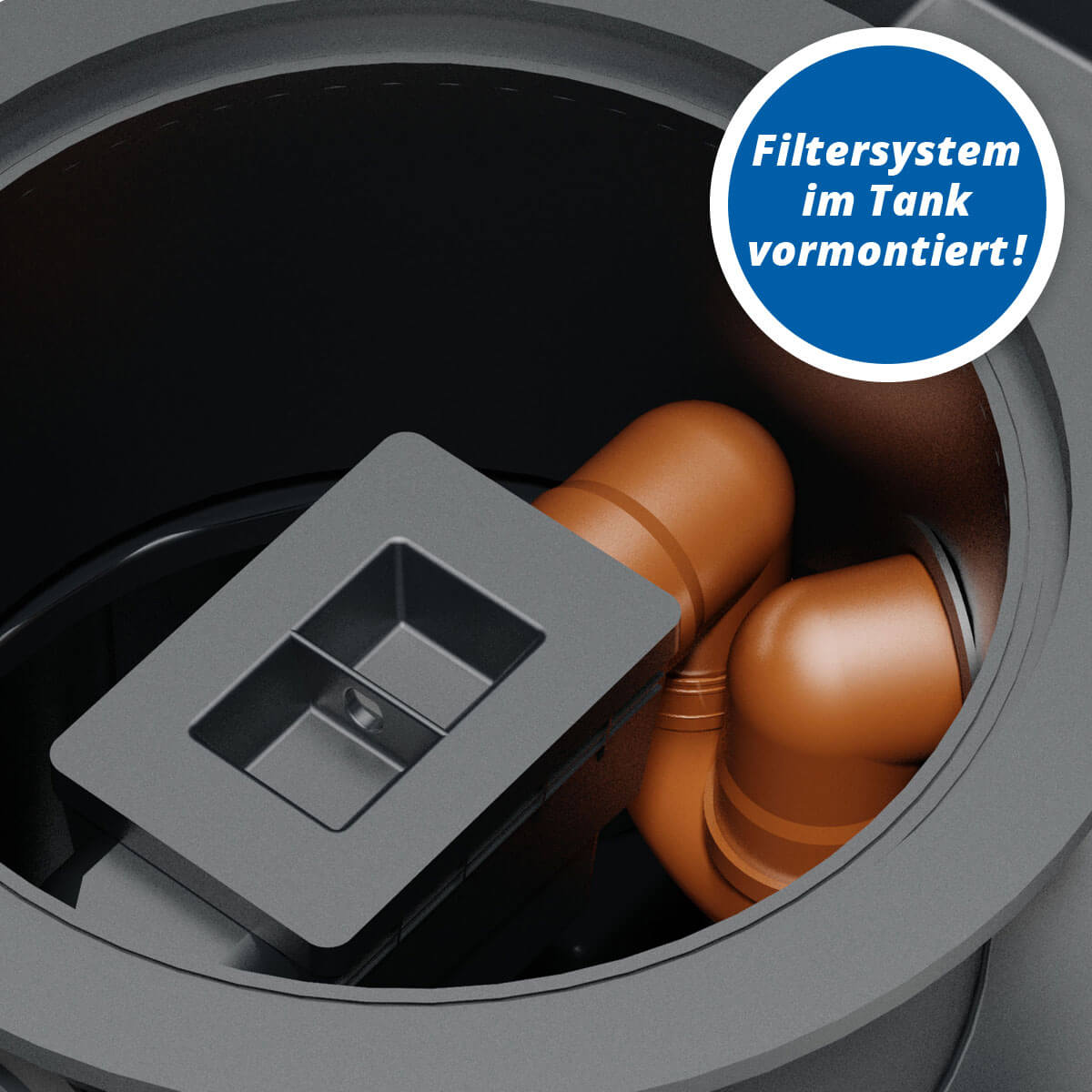 "Hausfilter pro" (inkl. Überlaufsiphon): Dieser hochwertige Tankeinbaufilter garantiert eine optimale Reinigungsleistung und wurde speziell für die AQa.Line Hausanlagen konzipiert. Filter und Überlaufsiphon sind bereits vormontiert und bei Bedarf sehr leicht zu reinigen.