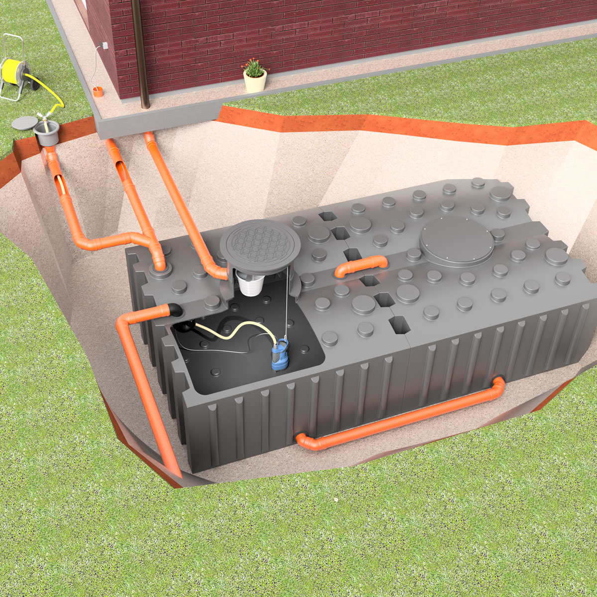 Funktionsweise: Das anfallende Regenwasser wird über ein oder mehrere Fallrohre in die Zisternen geleitet. Der vormontierte Filterkorb entfernt die Feststoffe und kann zur Reinigung entnommen werden. Die im Tank befindliche Tauchdruckpumpe "GAP X80" oder die besonders leistungsstarke "Tauchdruckpumpe GAP X120" versorgt über den Druckschlauch die frei im Garten platzierbare Wasseranschluss-Box. Zur Wasserentnahme einfach den Gartenschlauch an der Wasseranschlussbox aufstecken (Klick-System) - fertig! Beim Aufdrehen der Spritzdüse des Gartenschlauches, schaltet sich die Pumpe automatisch ein und beim Schließen wieder aus. Die Pumpe verfügt über einen integrierten Trockenlaufschutz (bei leerer Zisterne).