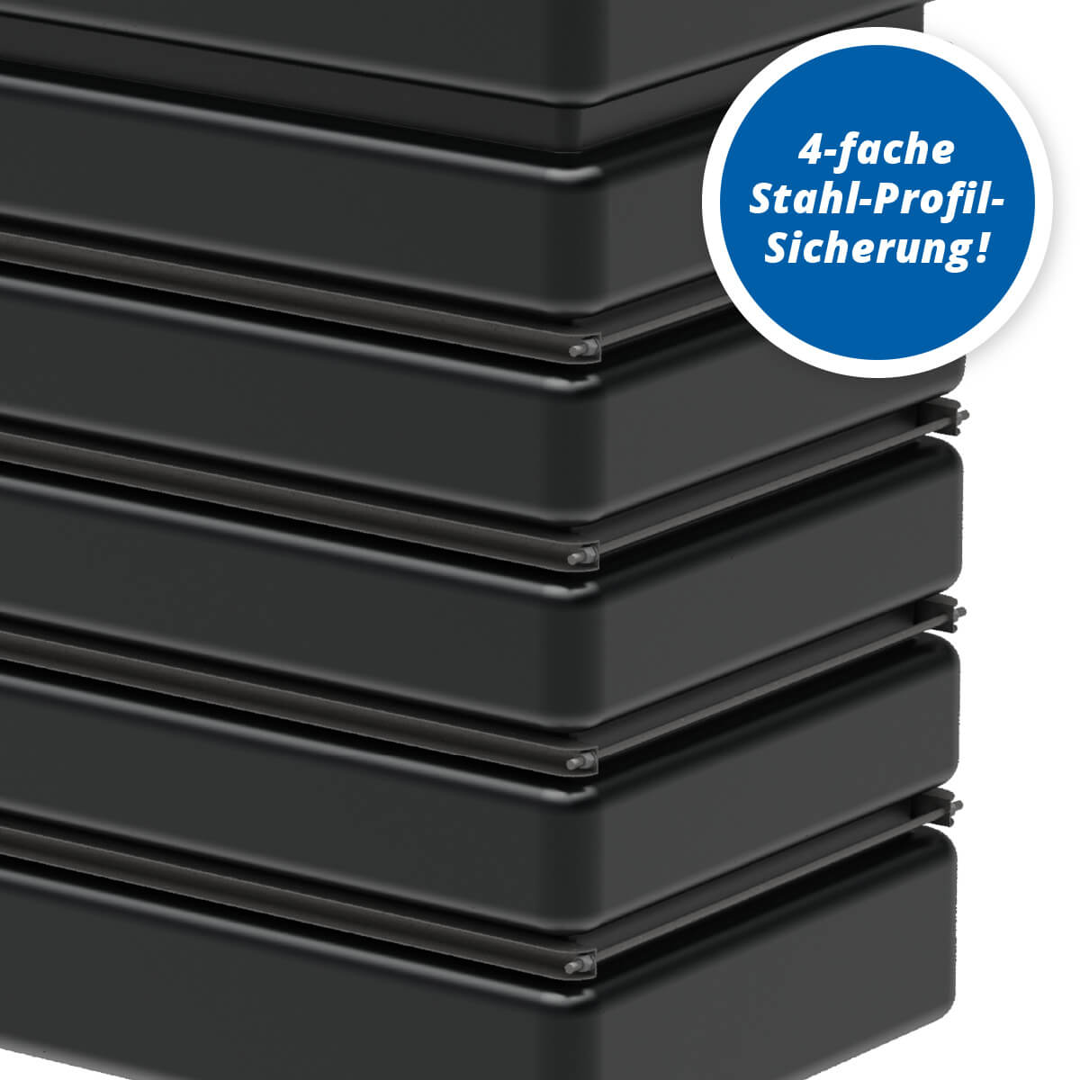 - Mit 4-facher Stahl-Profil-Sicherung – bestens geeignet für die oberirdische Aufstellung