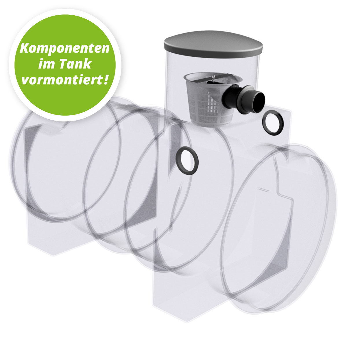 Gartenfilter: Der leicht zu montierende Filterkorb ist Garant für eine hervorragende Reinheit des gesammelten Regenwassers. Selbst kleinste Schmutzpartikel werden zuverlässig herausgefiltert.