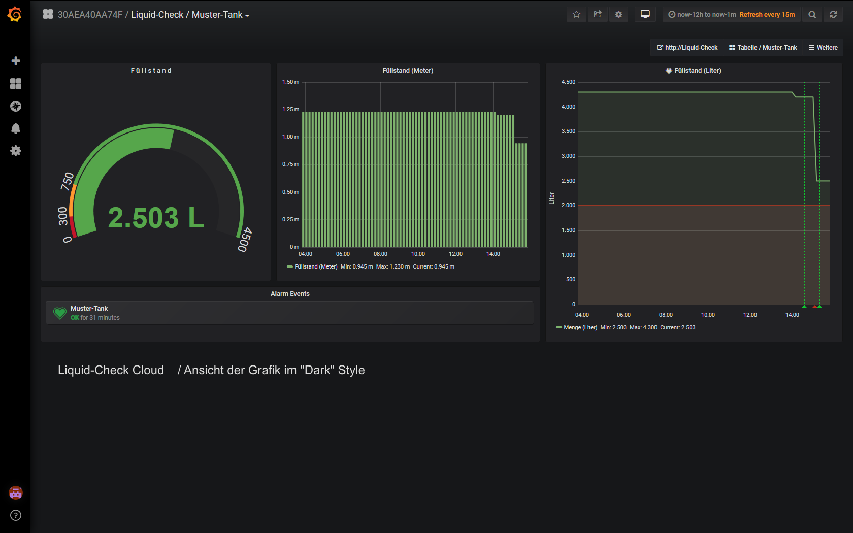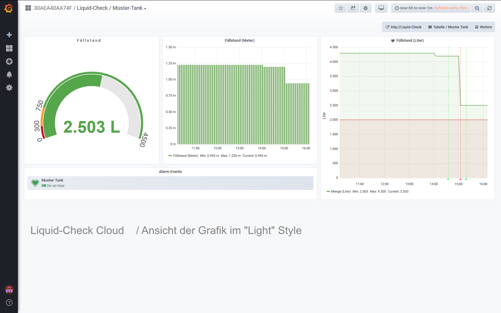 Die Füllstandsanzeige verfügt über Schnittstelle zum Webportal des Herstellers, um Ihre Messwerte in einer Cloud aufzeichnen zu können. Dazu wird die Visualisierungssoftware "Grafana" verwendet. Die Software ermöglicht das Speichern und grafische Aufbereiten der Messwerte. Zudem haben Sie über Ihren Login die Möglichkeit, den Füllstand auch an einem anderen Ort (z.B. mittels Smartphone) zu überwachen. Hierzu kann außerdem eine Alarm-Funktion eingestellt werden, die dann bei Erreichen eines bestimmten Füllstands ausgelöst wird (auch mittels Email-Benachrichtigung).