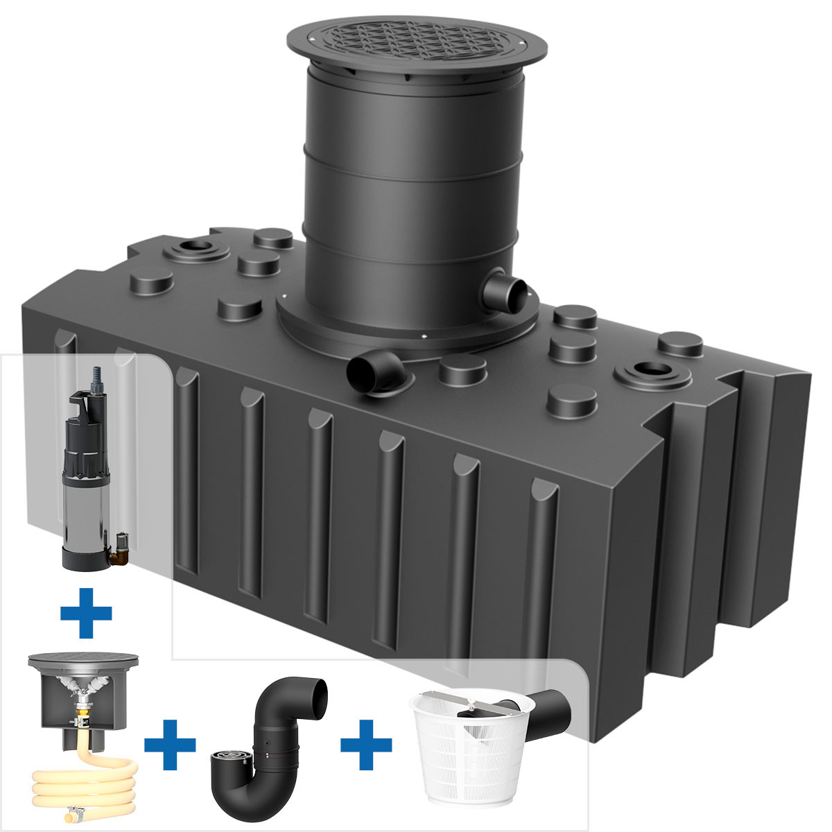 Funktionsweise: Das anfallende Regenwasser wird über ein oder mehrere Fallrohre in die Zisternen geleitet. Der vormontierte Filterkorb entfernt die Feststoffe und kann zur Reinigung entnommen werden. Die im Tank befindliche Tauchdruckpumpe "GAP X80" oder die besonders leistungsstarke "Tauchdruckpumpe GAP X120" versorgt über den Druckschlauch die frei im Garten platzierbare Wasseranschluss-Box. Zur Wasserentnahme einfach den Gartenschlauch an der Wasseranschlussbox aufstecken (Klick-System) - fertig! Beim Aufdrehen der Spritzdüse des Gartenschlauches, schaltet sich die Pumpe automatisch ein und beim Schließen wieder aus. Die Pumpe verfügt über einen integrierten Trockenlaufschutz (bei leerer Zisterne).